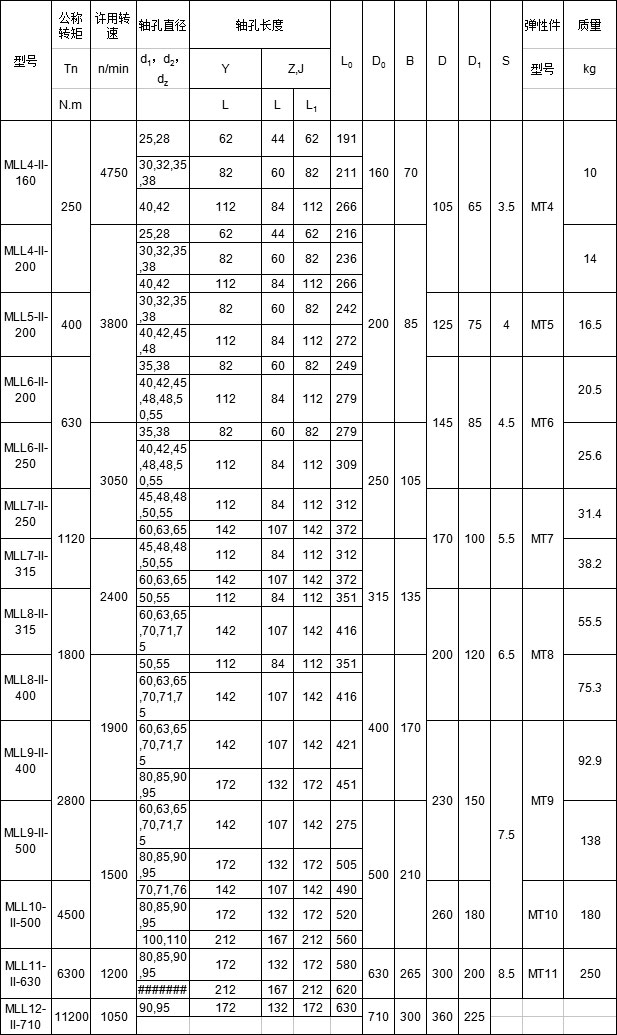 MLL-II(LMZ-II)梅花联轴器 特点及应用场合:具有补偿两轴相对偏移、减振、缓冲性能、径向尺寸小,结构简单、不用润滑、承载能力较高,维护方使、更换弹性元件需轴向移动 (MLS型除外),适用于联接同轴线,起动频繁,正反转变化,中速、中等转矩传动轴系和要求工作可靠性-高的工作部位。不适用于重载、低速及轴向尺寸受艰制,更换弹性元件后两轴对中困难的部位。