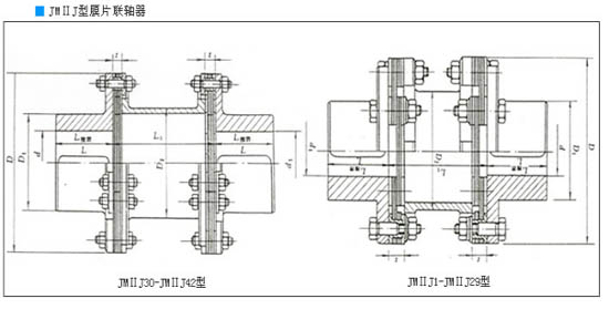 JMⅡJ膜片联轴器 特点及应用场合:与金属弹性元件挠性联轴器相比,具有机械强度高,承载能力大、质量轻结构尺寸小、传动效率和传动精度高,装拆方便等特点。适用于中、高-速、大转矩轴系传动。与鼓形齿式联轴器相比,具有无相对滑动,不需润滑,使用寿命长、无噪声、结构简单等特点.可部分代替鼓形齿式联辅器。不受温度和油污影响。具有耐酸、碱,防腐蚀的特点。可用于高温、低温和有油、有水和腐蚀介质的工况环境.适用于各种机械装置载荷变化不大的轴系传动,通用性-强,工业发达国已普遍采用,是我国重点推广应用的高-性能挠性联轴嚣,高-精度膜片联轴器可用于高-速工况。膜片联轴器与齿式联轴器相比,没有相对滑动,不需要润滑、密封,无噪声,基本不用维修,制造较方便,可部分代替齿式联轴器。膜片联轴器在国际上工业发达国应用已很普遍,在实际应用中一般采用接中间轴型,以提-高两轴线偏移补偿性能。