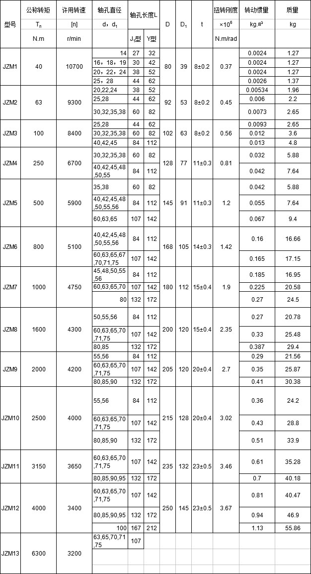 JZM膜片联轴器 特点及应用场合:与金属弹性元件挠性联轴器相比,具有机械强度高,承载能力大、质量轻结构尺寸小、传动效率和传动精度高,装拆方便等特点。适用于中、高-速、大转矩轴系传动。与鼓形齿式联轴器相比,具有无相对滑动,不需润滑,使用寿命长、无噪声、结构简单等特点.可部分代替鼓形齿式联辅器。不受温度和油污影响。具有耐酸、碱,防腐蚀的特点。可用于高温、低温和有油、有水和腐蚀介质的工况环境.适用于各种机械装置载荷变化不大的轴系传动,通用性-强,工业发达国已普遍采用,是我国重点推广应用的高-性能挠性联轴嚣,高-精度膜片联轴器可用于高-速工况。膜片联轴器与齿式联轴器相比,没有相对滑动,不需要润滑、密封,无噪声,基本不用维修,制造较方便,可部分代替齿式联轴器。膜片联轴器在国际上工业发达国应用已很普遍,在实际应用中一般采用接中间轴型,以提-高两轴线偏移补偿性能。