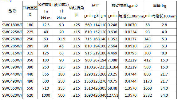 SWC-WF型万向联轴器 特点及应用场合:联接两个不同轴线的轴系传动,不能缓冲、减振,采用整体叉头结构,轴承固定不用螺栓,避免了螺栓松动断裂,便于维修,延长使用寿命,承载能力大、倾角大,可在β≤5°~25°工况下工作。适用于轧钢机械、起重运输、工程机械、石油机械及其他重型机械,为不同安装型式要求,有七种结构型式: