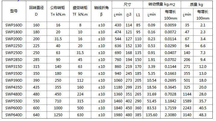 SWP-D型万向联轴器 特点及应用场合:轴承是易损件.为便于更换轴承,将轴承座压盖作成剖分式,螺栓联接,可在β≤5°~10°工况下工作。适用于轧钢机械、起重运输机械、工程机械、矿山机械、石油机械及其他重型机械,联接两个不同轴线的轴系传动,不能缓冲、减振。